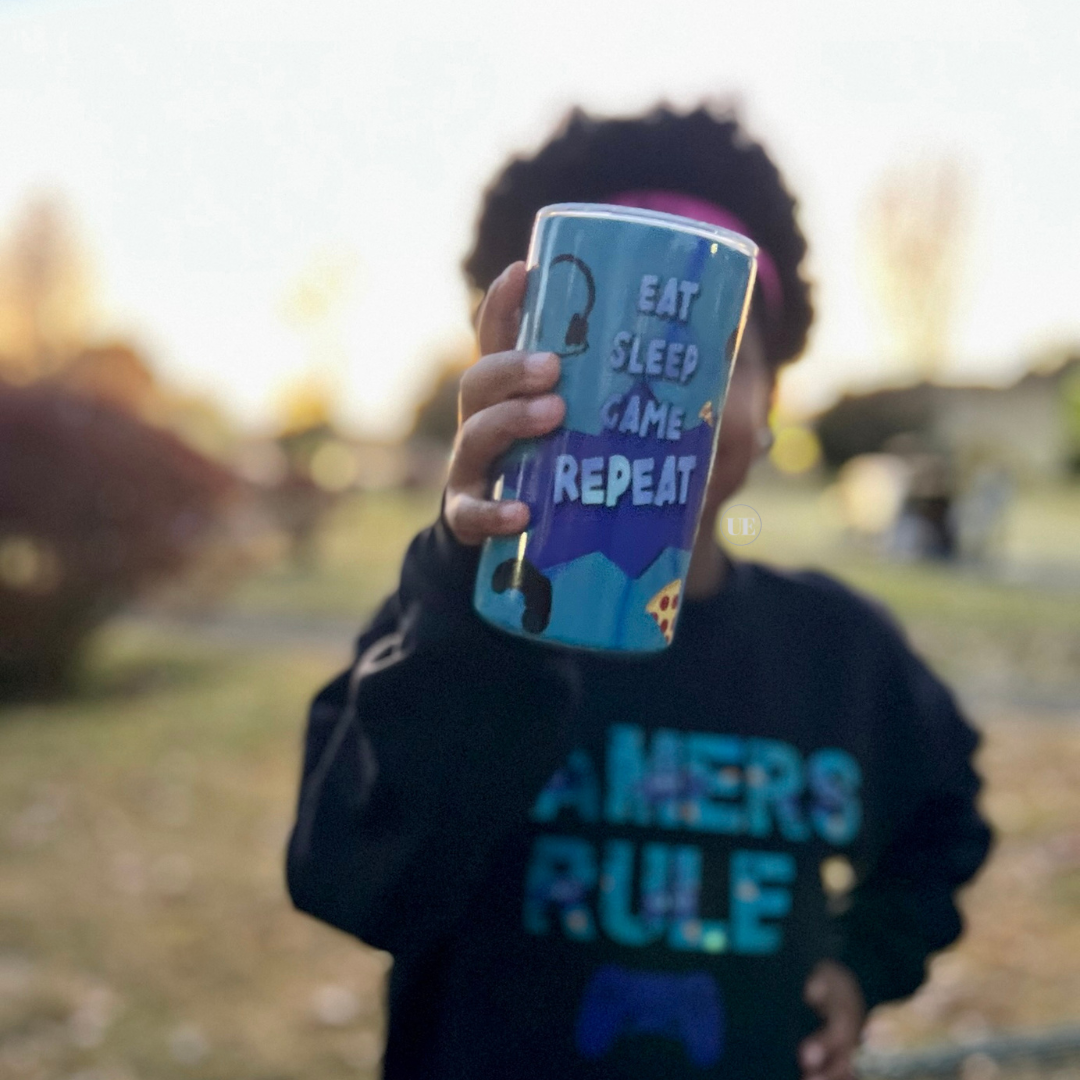 Keep your GAMER KIDS hydrated in style! With a 14oz stainless steel tumbler and metal straw, they'll stay fueled during their gaming marathons. Plus, the plastic lid with suction seals in drinks and prevents spills. Let their gaming levels rise with every sip. Cheers!